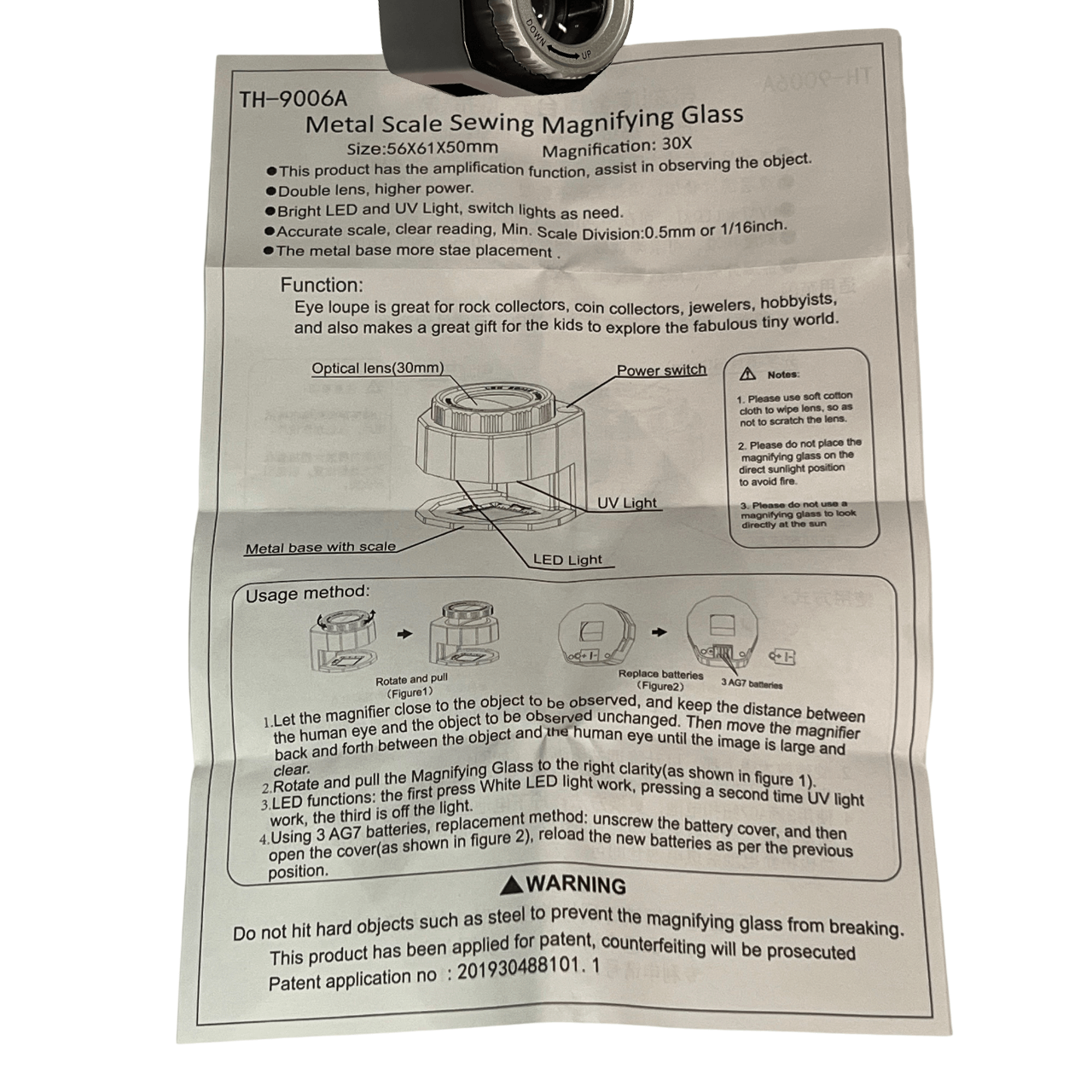 The TH-9006A 30x magnifying loupe is a compact precision magnifier designed for detailed inspection and measurement. Featuring a double lens system for higher magnification, it provides clear, enlarged viewing of small objects such as watch components, sewing details, stamps, jewelry, and electronics.