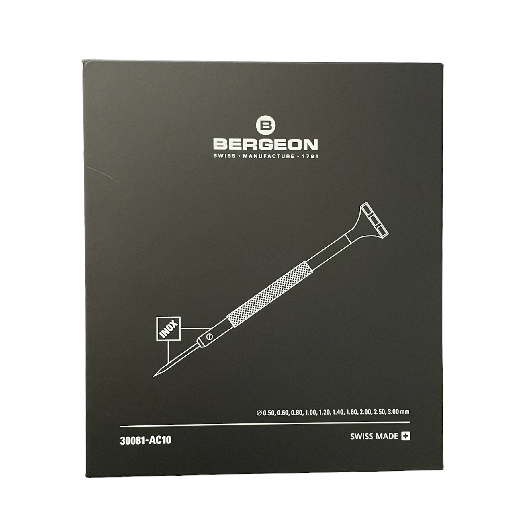 The Bergeon 30081-AC10 set of 10 INOX watchmaker screwdrivers comes in a sturdy box, perfect for storing and transporting your toolkit.