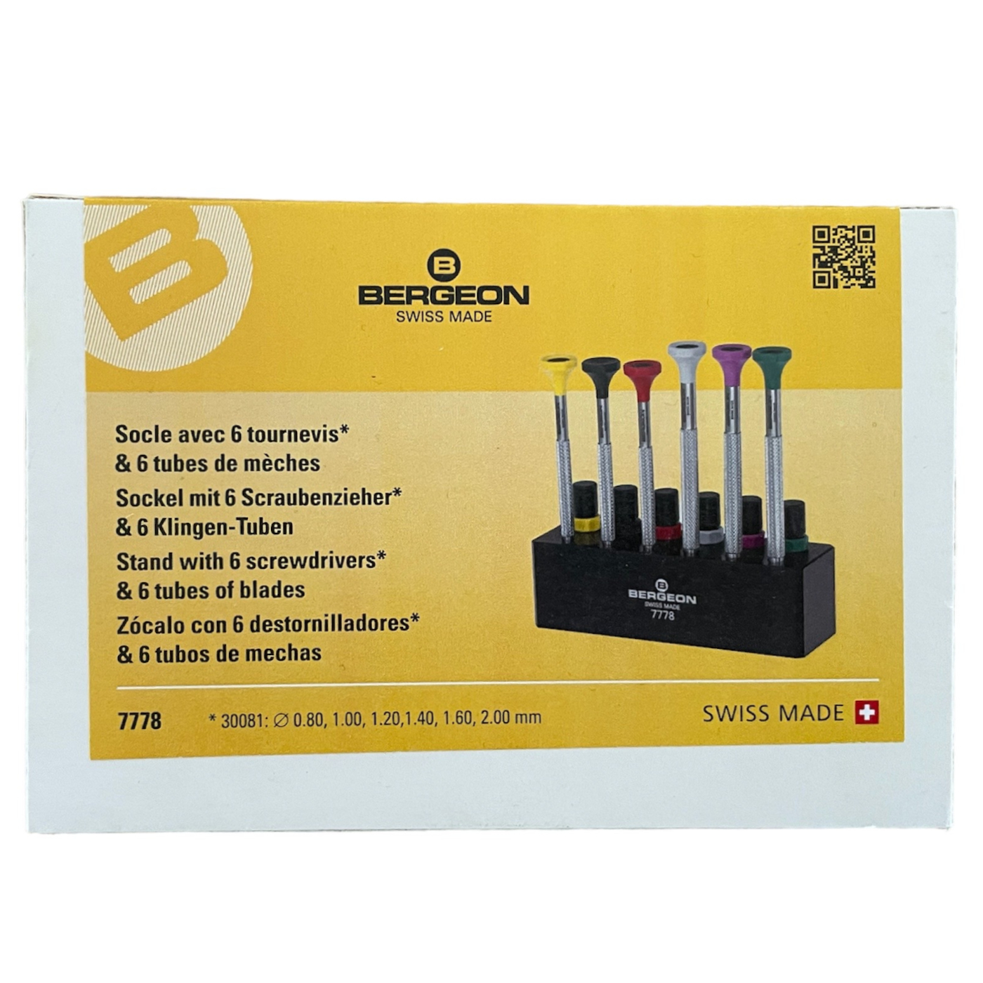 The Bergeon 7778 Stand is a meticulously crafted tool set designed for discerning watchmakers and precision instrument enthusiasts. This comprehensive set combines a robust, non-slip base stand with six high-quality Bergeon screwdrivers, alongside a generous supply of spare blades.