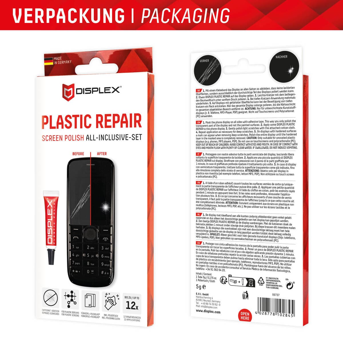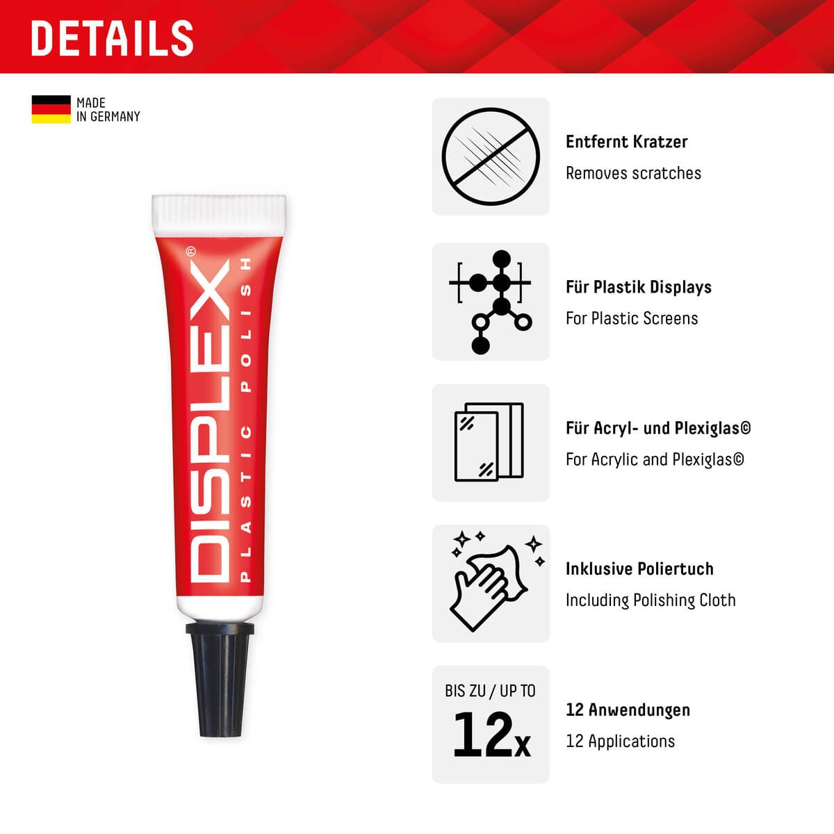 Bring back the shine and clarity of your device display with DISPLEX Scratch Repair Paste (DISPLEX Plastic Repair / Handy-Display Politur), a specialist polishing paste designed for uncoated plastic display surfaces such as plastic, acrylic, and Plexiglas®.