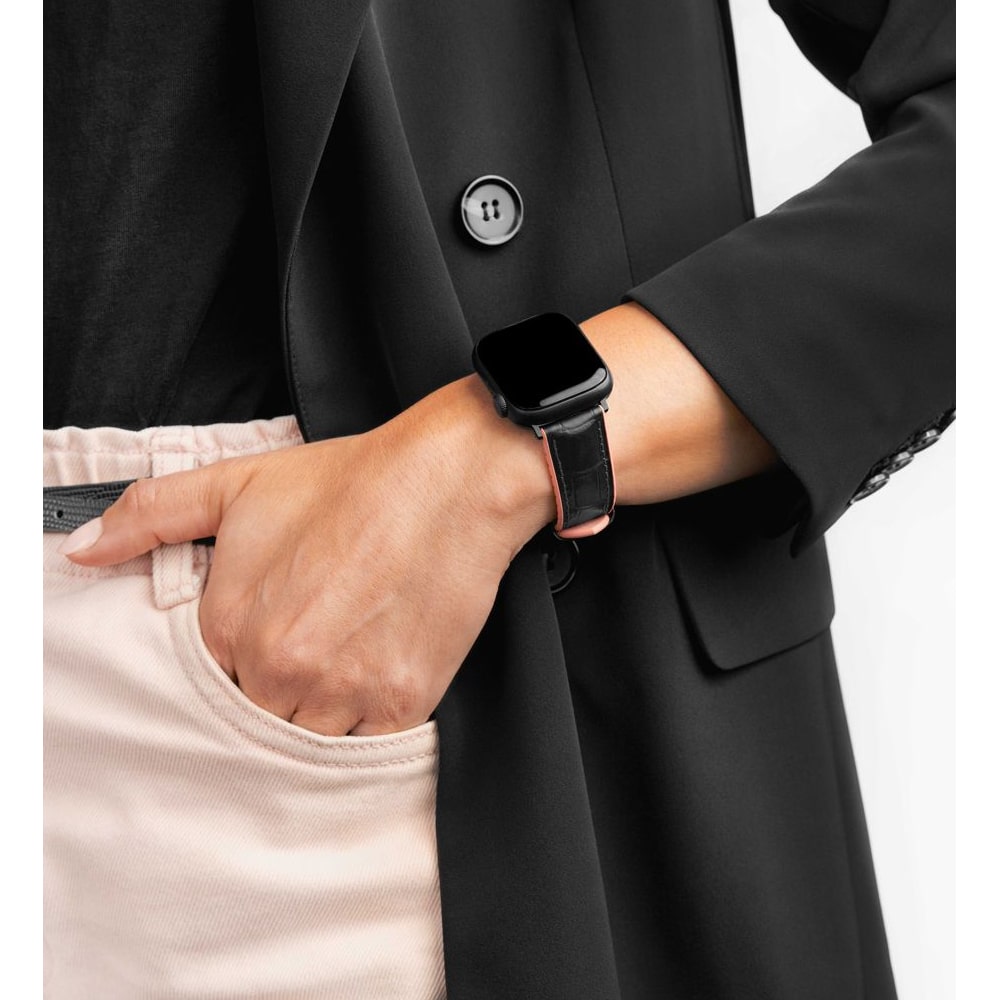 The Hirsch Andy M watch strap exudes a sense of sophistication and elegance, thanks to its sleek black design paired with the vibrant pink calf leather. This striking combination is sure to make a statement on any wrist.