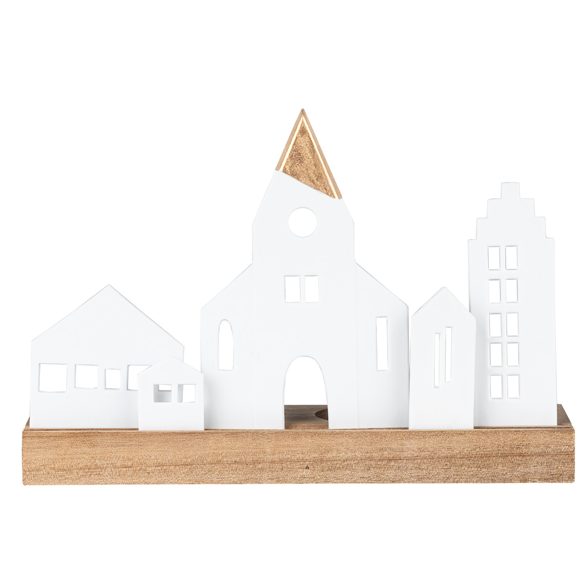 The Illuminated Decoration, City features a sturdy base crafted from premium acacia wood, providing a beautiful foundation for the delicate porcelain elements. Each porcelain component is carefully inserted, creating captivating light and shadow effects that shift with the movement of the flame (tea light not included). This meticulous craftsmanship ensures a truly mesmerizing display.
