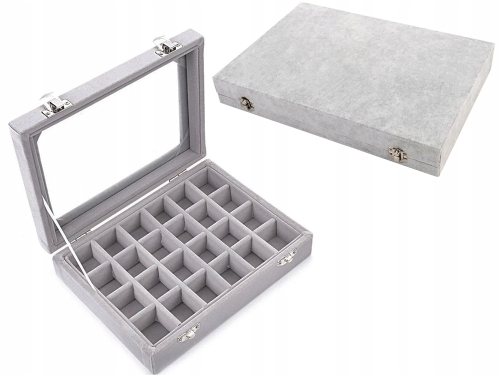 This elegant jewellery box organiser is the perfect solution for keeping your jewellery neatly arranged, protected, and easily accessible. Crafted from a stylish grey suede-style velvet, it features a glass lid that beautifully displays your collection without the need to open the box. This makes it an ideal choice for both home use and retail environments such as jewellery shops and pawnshops.
