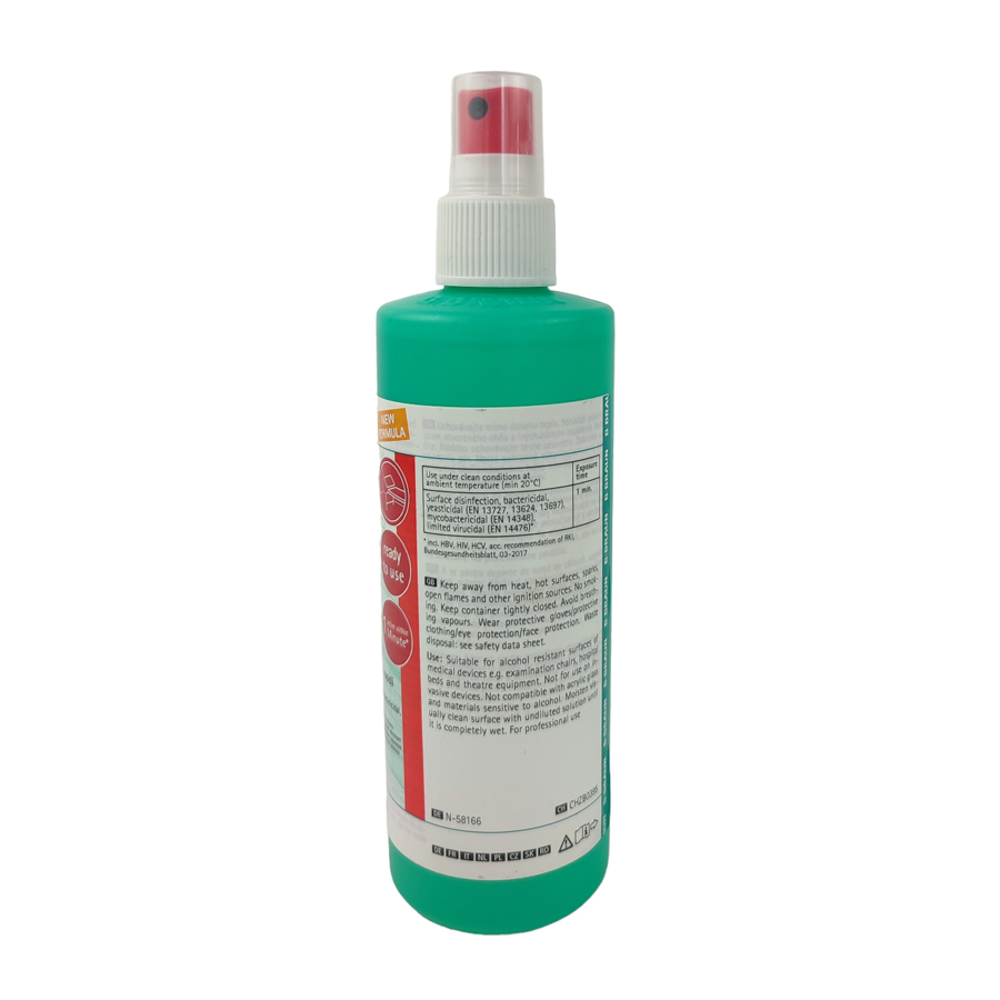 The product is available in various sizes, including a 250 ml spray bottle with pump, a 1 litre bottle without spray head, and a 5 litre canister. This flexibility ensures that users have the right amount of disinfectant for their specific needs.