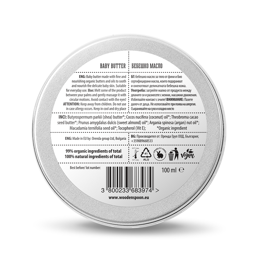 Introducing the WOODEN SPOON Organic Baby Body Butter (100 ml), a luxurious and gentle moisturizer crafted specifically for your baby’s sensitive skin. Made with a carefully selected blend of premium, organic butters and oils, this body butter provides deep nourishment and soothing relief, perfect for everyday use.